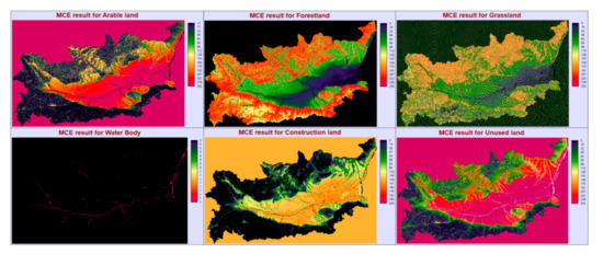 The CA-Markov model in IDRISI 17.0 Selva software [46] was utilized to project LUCC spatial patterns of the Guanzhong region. In the CA-Markov module, an analytic hierarchy process (AHP) was applied to the determination of weights and introduced into a multi-criteria evaluation (MCE) decision to obtain the suitability map. Suitability maps were generated or provided (externally) from driver information, and each driver was considered as a real number (%).