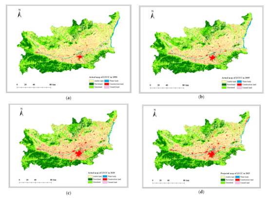 Comparison of LUCC maps for actual years (1990 (a), 2005 (b), and 2020 (c)) and the projected year (2025 (d)).