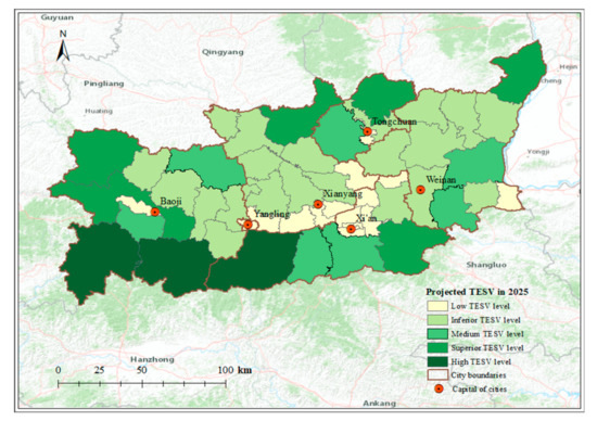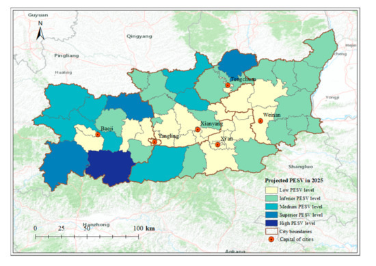 The results of the CA-Markov and logistic model were used to project the per capita ESV in 2025. Here, the results show that the PESV maintained the spatial heterogeneity characteristic of decreasing from west to east and from periphery to inner periphery (Figure 11). By 2025, the highest-level area remains around Baoji City, i.e., Taibai County. Moreover, the low-level counties were projected to grow from 14 in 2020 to 26 in 2025, 10 of which are from Xi’an City. As of 2025, Xi’an city is projected to have the fastest population growth, while Baoji adds only 7% of Xi’an’s population. This implies that urban population pressure has a significant impact on the yield of ES, which is also consistent with previous findings [21,64].
