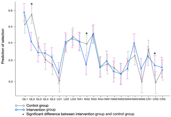 The results from the mixed effects logistic regression show a difference in the probability of adopting credits between the groups. The pictures depicting the effect of climate-related events tend to have a positive effect on the selection of climate and risk credits (see the blue dot for CR2 and CR3 in Figure 2). Decreasing climate change risk to the project (Envision credit CR2) is selected significantly more by participants who received the images of flooding (for the intervention group, the odds ratio = 1.54, p < 0.05 in Table 3). In addition, the results from the logistic model indicate a significant difference in the selection of the credit to minimize noise and light pollution (QL2) and decrease energy consumption (RA2) (see the blue dot for QL2 and RA2 in Figure 2). Participants in the control group tended to select the QL2 credit and RA2 credit more often than participants in the intervention group, with an odds ratio of participants in the control group compared to the intervention group selecting QL2 of 0.51, p < 0.05 and RA2 of 0.59, p < 0.05 (Table 3).