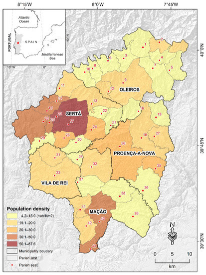 - Almeida, A.; Nunes, A.; Figueiredo, A. Dinâmica da população intraconcelhia no Interior Centro e Norte de Portugal. Cad. Geogr. 2008, 26–27, 41–52. [Google Scholar] [CrossRef]