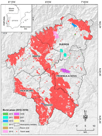 - Pereira, M.G.; Malamud, B.D.; Trigo, R.M.; Alves, P.I. The history and characteristics of the 1980–2005 Portuguese rural fire database. Nat. Hazards Earth Syst. Sci. 2011, 11, 3343. [Google Scholar] [CrossRef]