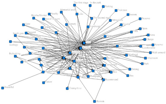 The word frequency reflected the content and degree of tourists’ attention to the Haizhu Wetland. The top 200 high-frequency words that appeared were extracted through the “word segmentation” and “word frequency statistics” functions of Rost CM 6. These were divided into nouns, verbs, adjectives, and adverbs according to their characteristics. Among them, nouns accounted for the highest proportion (59.5%). This mainly represented natural scenery, cultural scenery, ecological environment, tourist objects, transportation and basic wading in wetland parks. Adjectives and verbs accounted for 16% and 20%, respectively. Adjectives represented the tourists’ travel experience perception. Verbs represented the tourists’ main types of activities. Adverbs, such as “after,” “next time,” “usually,” and “before,” represented their visit frequency, time, and revisiting chance.