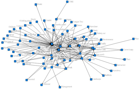 To further understand the tourism experience elements that affected the tourists’ positive and negative reviews, positive semantic network analysis was performed. This was conducted by extracting the reviews with scores of “4” and “5.” The reviews with scores of “1” and “2” were analyzed for a negative semantic network to generate negative semantic network diagrams. Nodes represented elements of high-frequency tourism experience. The density of the connections between the elements represented the frequency of the co-occurrence of the elements [57]. As shown in Figure 1 and Figure 2, a beautiful ecological environment, fresh air quality, rich scenery, reasonable ticket prices, and convenient external transportation were all important factors. These improved the satisfaction of the tourism experience. The factors leading to negative reviews were scattered. These were mainly focused on internal transportation facilities, management services, infrastructure, poor ticket prices, a lack of shade, and irregular construction in the park.