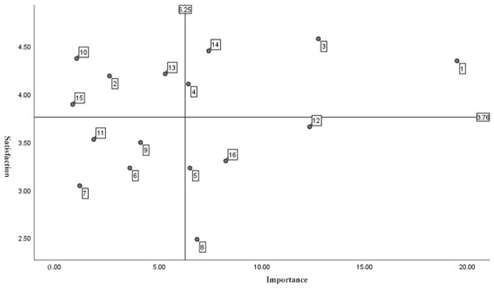IPA is an important performance analysis method. It divides the four-quadrant matrix. This is based on the importance of the evaluation indicators and the level of performance satisfaction [54]. It considers the relative importance of tourism experience elements and the satisfaction of tourists with their performance. A targeted strategy was proposed for each tourism experience element of the Haizhu Wetland [55,56].
