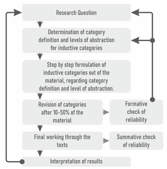 We analysed the data collected during our primary research through qualitative content analysis. The nature of the investigation was inductive, that is, the researcher started from the data and progressed upwards, and any theories were only guidelines. Researchers looked for, organised, and elevated to a more abstract level any patterns, categories, or themes observable in the empirical data. Qualitative content analysis (QCA) is a systematic analytical procedure. Its aim is to let us draw consequences regarding the patterns that are present in the text. This analytical method can be utilised for uncovering subjective interpretations through the identification and coding of themes and patterns found in the data [65]. According to Mayring (2000) [66], it can be said that during the utilisation of the QCA method, texts are analysed within the context of communication, and following pre-determined steps. These steps can be summarised as follows (Figure 3):