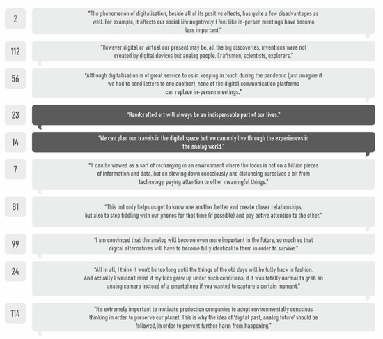We deemed the findings of our research (starting in 2018 and still ongoing) relevant for the formation of our concept. This longitudinal research provides an opportunity for the parallel investigation of pre-COVID-19 and post-COVID-19 results. However, a comparative analysis was not among the goals of the study. We considered the number of mentions and the frequency-of-mention throughout the whole sample, the direct interpretations of the statements of respondents, and the connections of themes observed in the text for the determination of the weight of particular themes, which increased with time. The following are the relevant themes and patterns identified this way, originally from the pre-COVID-19 era but also appearing in the post-COVID-19 era: (1) a rise in analog experience-seeking, (2) the recognition of the importance of in-person contact, (3) a lack of analog knowledge transfer and value creation, (4) the complementary role of digitalisation, (5) the connection between virtuality and separation, (6) topics related to a sustainable community lifestyle.