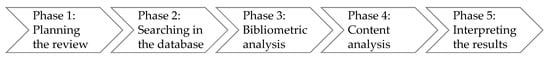 This research included a systematic literature review (SRL), which consolidates the results of different studies on a subject with the aim of achieving greater understanding and reaching a level of conceptual or theoretical development [43]. For performing the SRL, bibliometric and content analyses were used. Thomé et al. [44] explain that a qualitative SLR is often combined with quantitative methods, such as the bibliometric analysis to identify and visualize emerging themes. The approach and steps taken followed the instructions for SRL from the studies of Thome et al. [44], and Tranfield et al. [45]. First, the review scope and purpose were clearly defined, as well the database, keyworks, and criteria for the searches were chosen. Second, the search strategies were put in practice. This is, the search for articles was conducted in the database and the predefined filters and criteria were applied to the sample. In the sequence, all the abstracts were read to define the final sample. The third step involved performing a bibliometric analysis with the purpose of identifying the evolution of research topic, discover the most relevant articles and authors, countries and institutions to understand the stage of development of the theme [46]. Next, in the fourth phase, a content analysis was carried out to deepen the knowledge on the topic by synthesizing the main contributions of the studies in the analyzed sample. For that, a data gathering template was created to ease the extraction of the information [44]. Finally, the data retrieved from the bibliometric and content analyzes were interpretated and discussed. Figure 1 summarized the phases of the SRL, and the details of each phase are explained in the following sections.