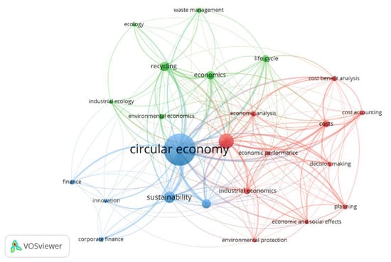 The keyword network presents the information provided by the authors of the publications. Figure 4 demonstrates the network of keywords generated from the sample extracted from Scopus and includes terms with at least five occurrences, that is, the number of publications in which the words occur together. The term “article” was excluded from the network, as it was not related to the topic. There are three groups: red, green and blue. The most popular words are “circular economy”, “sustainable development”, “recycling”, “sustainability” and “economics”.