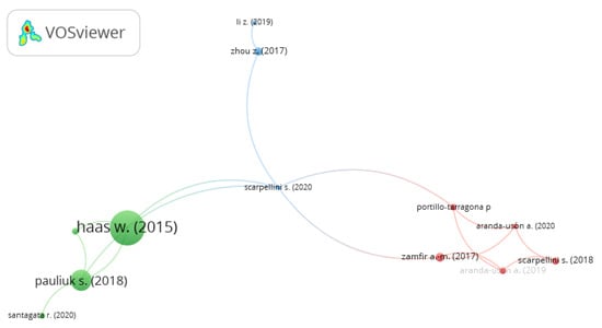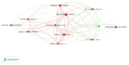 Figure 6 shows that the green, blue and red groups are mainly connected by Scarpellini S. [23], the blue grouping, which encourages the existence of a positive relationship between the circular scope of companies and their corporate social responsibility (CSR) and accountability. In addition, the author indicates that the relationship between the circular economy and the financial performance of companies, as well as the relationship between companies and circular economy practices, should be more thoroughly explored, as the existing studies on these themes are at an early stage [23]. To reach this conclusion, a study by Scarpellini [23], which is located in the center of the image and is the link between the three groups, aims to define the environmental capacity in a business since the concepts of circular economy are introduced in the event that the authors used as a research method the modeling of partial least squares structural equations.