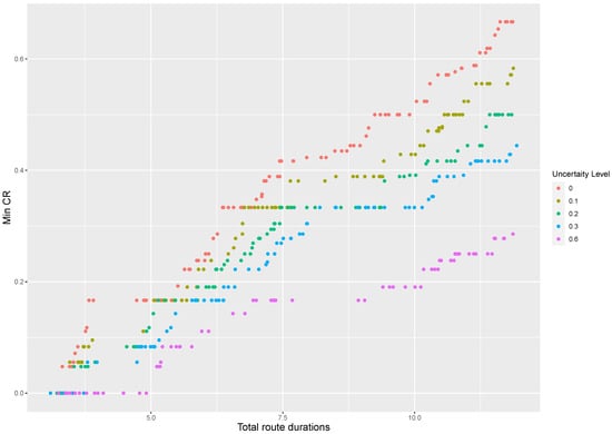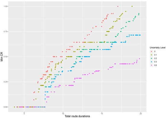 In this section, we provide a two-dimensional visualization of the non-dominated solutions at different levels of travel-time uncertainty for different instances of the SARP. The horizontal axis shows the total route duration and the vertical axis represents the minimum coverage ratio.