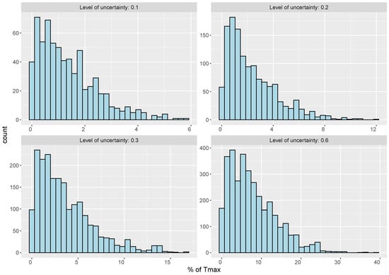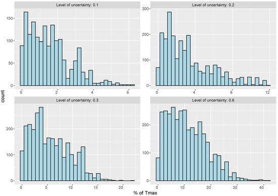 As we can see in Table 3, by increasing the level of uncertainty, more solutions become infeasible. An infeasible solution is a solution that has at least one route that exceeds . However, as mentioned above, route infeasibility in deterministic settings can vary from small to large violations of . To illustrate this, Figure 3 and Figure 4 show the histogram of the average violation of the solutions within the 100 simulation runs as a percentage of . For instance, when the level of uncertainty () is 0.1, most violations are less than 5 percent of . Therefore, at lower uncertainty levels, decision makers may decide to stick with the nominal values of travel time (deterministic approach), which would result in a higher coverage ratio. In this case, they would need to take the risk of a slight violation of the allowed time, which can happen in worse-case scenarios. However, at higher uncertainty levels, the risk of having a significant violation of is considerable, which increases the motivation to have a robust plan. To illustrate this, let us assume that the time unit of is based on days of 10 h of work for each assessment team. In this case, the violation of 30% in instance RC5 (where h) means that we have 9 h of delay in the assessment processes, which may negatively affect the disaster response program.