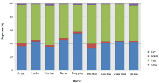 Data on the average composition of excavated soil in Shenzhen are unavailable. In order to obtain comprehensive information on the excavated soil composition, we conducted 108 drilling hole samplings in nine districts of Shenzhen (Figure 1). Figure 2 presents the average data of the corresponding excavated soil based on laboratory screening tests.