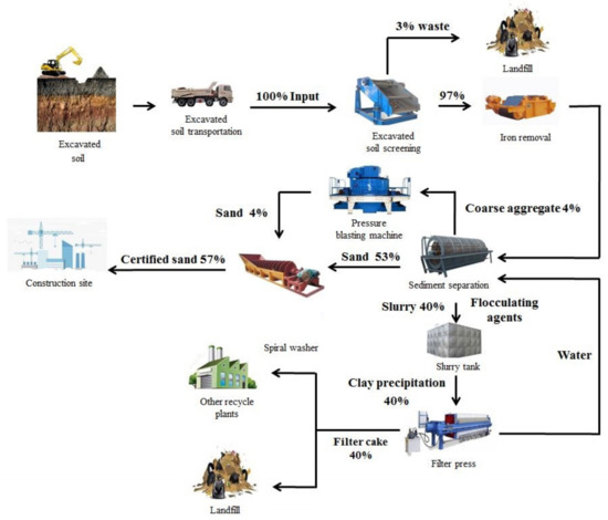 The data described in Section 2.2 reveal the large amount of sand contained in Shenzhen’s excavated soil, making up approximately 57%. However, due to the solid plastic property of clay, existing sand extraction equipment cannot completely separate the clay from the sand [43,44]. In order to overcome this problem, we designed a new technological process and manufactured the related equipment to extract recycled sand from high-plastic clay. Figure 4 depicts the process flow of the designed equipment. The soil was excavated in the construction site and recycled on-site or transported to the stationary recycling plant. The excavated soil was sieved to ensure that the adequately sized soil (50 mm–100 mm) could be separated, retained, and subsequently sent to be evenly separated using the designed equipment. An iron remover collected any scrap steel that could cause damage to the separation equipment, and the soil was transferred into the separation equipment by the conveyor belt. The separation equipment extracted the recycled sand from the soil, and the recycled sand was sent to the spiral washer for further cleaning. Moreover, the coarse aggregates were placed into a pressure blasting machine, ground into sand, and transferred to the spiral washer. The flocculating agents were added into the slurry tank to attract clay to form precipitation in the slurry. The clay precipitation was then piped into the filter press to make the filter clay cakes. Finally, the recycled sand was transported to the construction site. The filter clay cakes and waste in the excavated soil were taken to the landfill or stationary plant and further recycled into filter clay cakes.