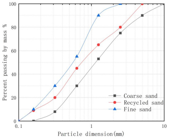 Although the excavated soil was collected from different foundation pits in construction sites across Shenzhen, the basic performances of the recycled sand exhibited minimal differences. Table 2 reports the physical and mechanical properties of the recycled sand, and Figure 6 depicts the corresponding grading curve. All the parameters (apparent density, bulk density, void content, fineness module, clay content, crush index, water absorptivity) meet the Chinese standard for technological requirements and test method, with the exception of the sand excavated from the soil using the tunnel boring machine, which is too fine to satisfy the standards.