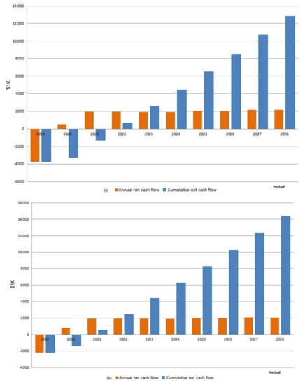 The cash flow trends over the stationary plant’s lifetime were evaluated using the cumulative cash flow for each year. In the discounted cash flow analysis, the IRR is a discount rate that makes the NPV of cash flows equal to zero. When the final cash value reached zero, the IRR’s numerical value was confirmed.