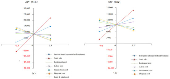 The recycling equipment had a planned operation period of 10 years, and thus fluctuations in the economic environment were anticipated, with the possibility of causing a risk of deficit to the business. We employed sensitivity analysis to determine which variable exerted the greatest economic impact on the recycling business. This was achieved by changing the most influential parameters (e.g., the service fee of excavated soil treatment, equipment costs, recycled sand sales, labor costs, disposal costs, and land and stationary plant costs). Parameters varied from ±5% to ±50% at the beginning of the recycling equipment’s lifetime. Figure 8a,b present the results.