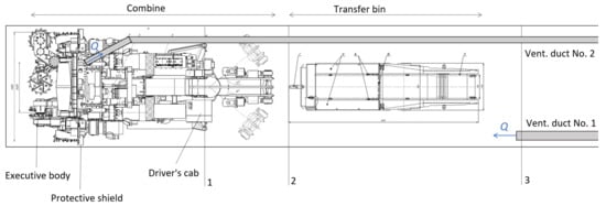 Ventilation of the drift can be carried out using a forced ventilation system, an exhaust system, or their combination. In the case of a forced system, the stream of fresh air is supplied through the ventilation duct No. 1 (see Figure 1) and flows round the combine (up to the protective shield). The polluted air is removed through the drift. In the case of an exhaust ventilation system, fresh air is supplied to the combine through the drift, and the polluted air is removed through the ventilation duct No. 2. The combined system involves the use of both ventilation ducts and, in essence, is an intermediate option between the forced and exhaust systems.