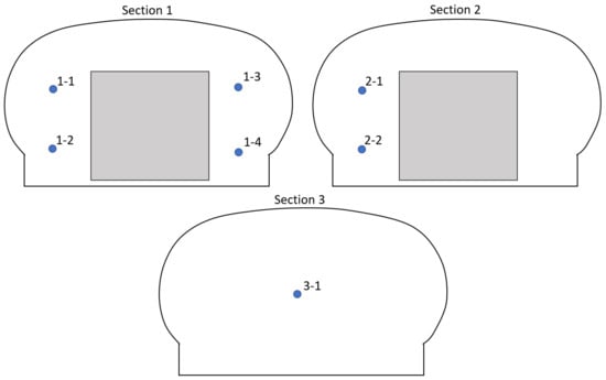 Figure 1 also shows the layout of the measurement sections in the longitudinal horizontal section of the drift. Figure 2 shows the measurement points for each measurement section. The combine driver’s cab is located in Section 1 and corresponds to measuring points 1-1 and 1-2. At each point, a series of measurements of the dust concentration was carried out; the arithmetic mean was then calculated. A portable dust analyzer Testo CEL-712 Microdust Pro was used. The measurement range of dust mass concentration is 0.1–1500 mg/m3 and the relative error is less than ±10% (after a preliminary verification procedure). The air flow velocity at each point was measured using APR-2 anemometer with an absolute error equal to 0.03 + 0.02 × V(m/s). For each point, the velocity and mass concentration of dust were measured continuously for 0.5–1 min, after which the time-averaged value was calculated.