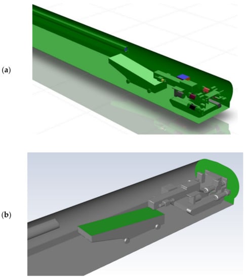 The computational domain was a dead-end drift 50 m long. The vertical section of the drift is shown in Figure 2 and Figure 3. Numerical simulation was carried out for a simplified model of a combine, which incorporated all the large elements that affect the dynamics of air and dust (see Figure 3). The subsequent detailing of the model leads to an exponential increase in the finite volume count in the computational mesh and to worsening of the convergence of the solution. This is related to the appearance of complex connections between individual parts of the combine and thin flow areas between them.
