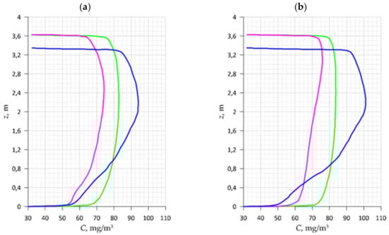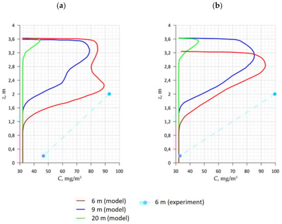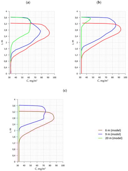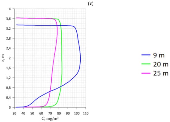An analysis of changes in the dust concentration near the combine driver’s cab was carried out, depending on the air flow in the drift. The dust concentration profiles along several vertical lines passing at a distance of 9, 20, and 25 m from the combine shield are shown in Figure 8. The distance of 9 m from the shield of the combine corresponds to the driver’s cab.