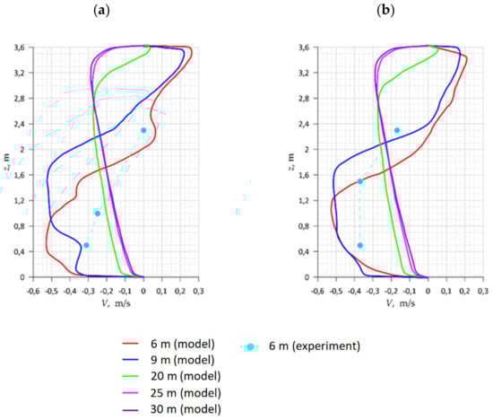 It is important to note that both adjustable parameters refer to the dust concentration field in a dead-end drift, while to improve the correspondence between the calculated and measured velocity fields, such parameters were not used. We tried to match the calculated velocity field and experimental velocity measurements by choosing the geometric parameters of the model that most reliably reflect the real geometry of the combine, drift, and ventilation duct. At the same time, several factors (some details of the geometry of the combine, the transfer bin, the unevenness of the drift walls and ventilation ducts, et cetera) remained unaccounted for in the model. This led to the impossibility of obtaining a perfect match between the measured and calculated aerodynamic parameters of the air for all measured sections and ventilation options. Figure 5 and Figure 6 show the model and experimental dependences of dimensional dust concentration and air velocity on the vertical coordinate, carried out in measurements along the selected vertical lines to the right and left of the combine in several cross sections of the dead-end drift.