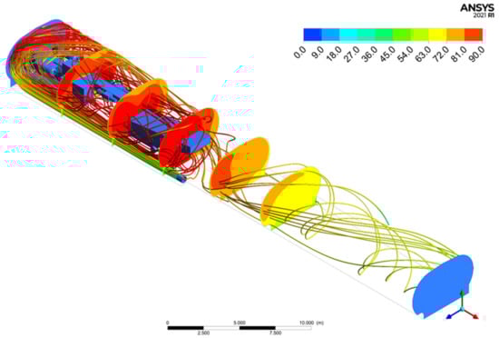 The described model was used to conduct several numerical simulations with various options for the ventilation of a dead-end drift. First, the influence of various air flows through the drift on the dust concentration field is considered. Figure 7 shows the streamlines in the dust–air mixture in the domain with a forced ventilation. The distance between the driver’s cab and the ventilation duct is 10 m, and the duct itself is located near the drift’s bottom to the left of the combine. The velocity of the air leaving the ventilation duct is 19.4 m/s and the diameter of the ventilation duct is 0.5 m. Thus, the amount of air supplied to the working area face was 3.8 m3/s.