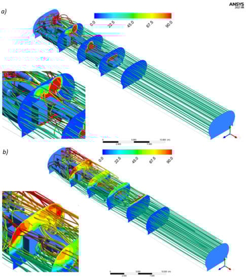 The simulation results for the standard ventilation mode (Figure 9b) show that in the case of exhaust ventilation, the dust concentration increases with height. On the left side of the combine (near the combine driver’s cab) at a height of 2 m, the dust concentration is 48–60 mg/m3 (zone 6–9 m from the shield), and at a height of 3 m, it is already around 85 mg/m3 to 92 mg/m3. This conclusion is confirmed by the visualization of the streamlines of the dust–air mixture (Figure 10b).