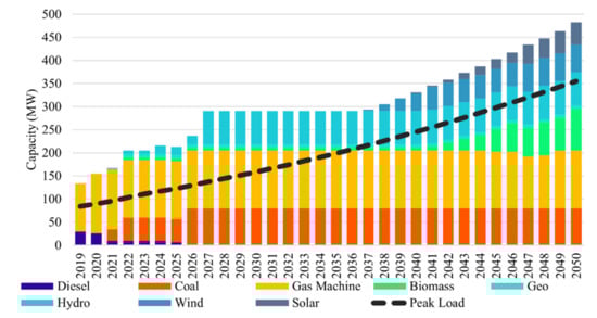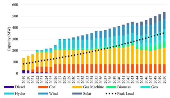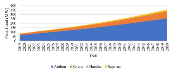 This section discusses the GEP results of all scenarios for the planning horizon from 2019 to 2050. The results for 2019 to 2024 were obtained from the national electricity supply business plan document [46], while those for 2025 to 2050 were obtained from the GEP optimization. Based on the results of the load forecast, the peak load in 2050 for the Ambon, Seram, Haruku, and Saparua systems is 256.8 MW, 76.7 MW, 3.43 MW, and 18.0 MW, respectively. The total peak load for the entire system would reach 354.7 MW in 2050.