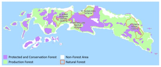 - Kementerian Lingkungan Hidup dan Kehutanan Republik Indonesia. Lampiran I Surat Keputusan Menteri Lingkungan Hidup dan Kehutanan Republik Indonesia No. SK.7875/MENLHK-PHPL/KPHP/HPL.0/12/2020. 2020. Available online: https://geoportal.menlhk.go.id/webgis/index.php/en/map/printed-map (accessed on 20 March 2021).
