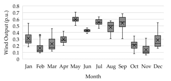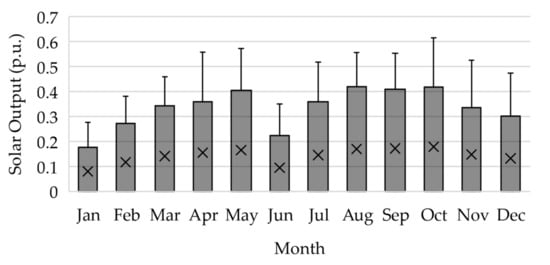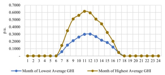 The highest wind and solar potential conditions are used to represent the best generation conditions, and the lowest conditions are used to represent the worst generation conditions. An example of a wind profile is shown in Figure 8, which shows the daily highs and lows of the wind profiles. The highest daily wind profile used was for May, with an average of 5.69 m/s and a standard deviation of 0.43 m/s, while the lowest daily profile was for November, with an average of 1.33 m/s and a standard deviation of 0.74 m/s. Based on the standard deviation value, it can be seen that, for the highest profile conditions in May, the variation in wind speed is lower than the lowest daily profile in November. This indicates that the intermittency that occurs during low wind speed conditions has a higher variability. The highest solar data has an average value of 0.179 p.u. with a peak generation of 0.61 p.u. and a standard deviation of 0.236 p.u. While the lowest solar potential has an average value of 0.088 p.u., with a peak generation potential of 0.30 p.u. and a standard deviation of 0.114 p.u. For potential solar energy, the value of the standard deviation of the lowest profile is smaller than that of the highest profile, which is also due to the lower peak of generation, when the gap between the generation values for each hour and the average of one day is lower than when the peak generation is high.