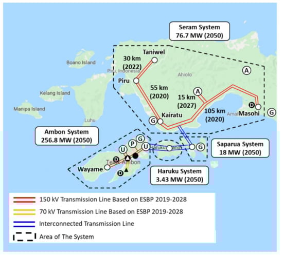 The Ambon–Seram Island region consists of many scattered systems on Seram Island and others scattered in the surrounding islands. These scattered systems include Ambon, Seram and other scattered systems with deficient demand. The Ambon–Seram system consists of four separate systems, which include two major systems: the Ambon system and the Seram system, and two small systems: the Haruku and the Saparua systems. However, the Seram system consists of four systems, namely, the Kairatu, Masohi, Piru and Taniwel systems, which are planned to be interconnected. A general description of the Ambon–Seram system is presented in Figure 1, where the four electricity systems are separated across an archipelago. The existing transmission lines have 150 kV and 70 kV voltage levels, as shown in Figure 1. In 2019, the peak loads for the Ambon system, Seram system, Haruku system, and Saparua system were 65.5 MW, 14.4 MW, 1.02 MW, and 2.9 MW, respectively, while the total energy consumption was 385.8 GWh, 83.1 GWh, 5.9 GWh, and 10 GWh with a load factor of 67%.