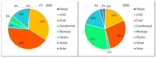 The interconnected system scenario requires the annual generating unit composition shown in Figure 13, which requires 482.5 MW of total capacity up to 2050, dominated by a gas machine of 125 MW. The interconnection transmission line would be operative in 2026. The RES composition consists of geothermal, biomass, hydro, wind, and diesel energy, with a total capacity of 7 MW, 90 MW, 72.6 MW, 59.8 MW and 48.1 MW, respectively, for each type of power plant. These figures produce the energy mixed shown in Figure 14, which meets the Indonesian government’s target of 31% RES in 2050. It was also found that the share of biomass would increase rapidly from 5% in 2025 to 31% in 2050. The increase in biomass composition is greater than that of the isolated system scenario, as the interconnected system can also optimize the use of local primary RES resources.