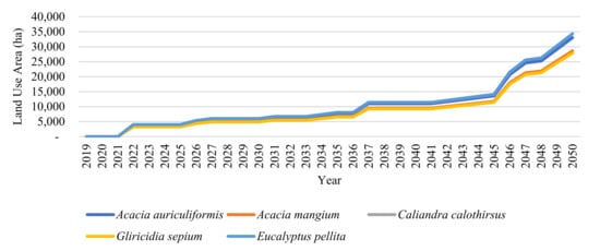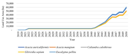 Moreover, the use of biomass at the end of the planning horizon under the interconnected system scenario is more significant than under the isolated system scenario by almost double. This shows that the interconnected system can make more use of the potential of the local biomass resources in Ambon–Seram. The highest land requirement is for using Eucalyptus pellita, which is 60,540 ha in 2050 in the interconnected scenario. The land area still meets the conditions of the existing production forests on Seram and Ambon Islands, which only use about 0.63% according to the forest map in Figure 4.