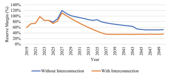 From the economic perspective, the interconnected scenarios provide a more economical generation cost, as presented in Table 10. The isolated system scenario would produce a total cost of USD 809.46 million. At the same time, the interconnected system scenario has a lower total cost of USD 773.7 million. The interconnected system had much better reliability due to resource sharing. If the isolated system needs to achieve the same reliability level as the interconnected system, a higher investment cost of USD 947.03 million would be required.