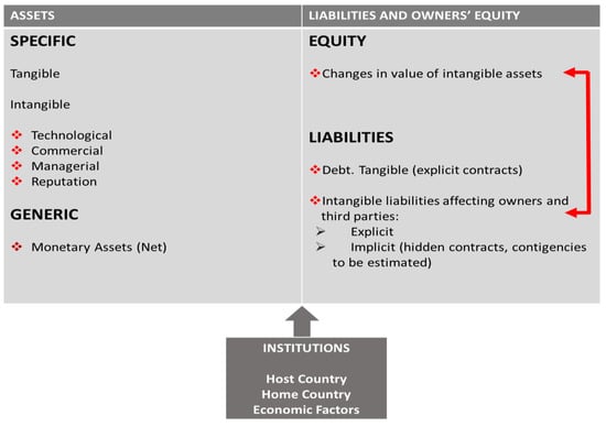Intangible assets and liabilities are two faces of the same coin, intangible liabilities are opposed to intangible assets as they produce losses that are difficult to quantify. On the other hand, they generate strategic value and may be accounted [35]. Figure 1 shows the accounting equation balance between assets and financing sources. In our approach, a decrease in intangible assets implies a loss in equity and, in some cases, the emergence of intangible liabilities. Intangible liabilities may therefore affect both partners and third parties: partners because the decrease in intangible assets value, and third parties because intangible liabilities can arise in form of fines, contingencies, payments to be declared, that affect stakeholders of the firm. Following this argument, intangible assets increase the value of the firm, and intangible liabilities may decrease the value of equity, in certain cases losing competitiveness.