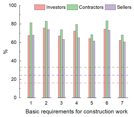 The highest number of correct answers was recorded in the contractor’s group—33.5%, and the lowest in investors—only 16.2%. Almost every fourth answered correctly among sellers of construction products—23.2%. Generally, the correct answers (indicating all the listed basic requirements) should be considered low. More accurate answers in the groups of contractors and sellers of construction products can be explained by frequent inspections of the correctness of placing construction products carried out by market surveillance authorities [54,55]. In Poland, due to the applicable legal regulations, these inspections mainly occur on construction sites and at points of sale of building materials [56]. It is most likely the reason for more correct indications in contractors and sellers than among investors.