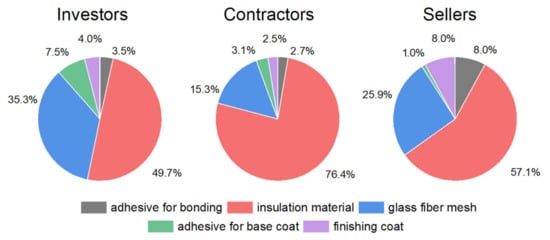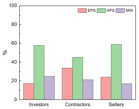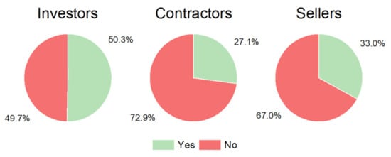 Table 2 shows the non-respondent rate in the individual surveyed groups of professionals. As previously stated, a confidence level of 95% and ±5% precision level characterized the calculated sample size for each of the surveyed professional groups. In individual professional groups (investors, contractors, sellers of construction products), 8, 39, and 4 respondents did not answer the questionnaire. It is worth noting that the number of respondents in each group determined by the study’s authors was more numerous than the required number of respondents for a given database size, calculated using Cochran’s formula for the small population (Equation (2)). Reducing the number of investors, contractors, and sellers of construction products and those who did not respond, we attained the number that responded. These numbers are also higher than the number of respondents required by Cochran’s formula for the small population (Equation (2)). According to Cochran’s formula for the small population, more respondents than required means that the results were obtained with more minor errors than the assumed confidence level of 95% and ±5% precision level.