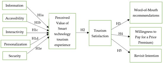 Tourists’ perception of STTs is an integral part of the tourism experience and an antecedent influencing tourists’ satisfaction and behavioral intention [14,42]. Therefore, it is essential to understand tourists’ perceptions about STTs. This study evaluates the impact of the five attributes mentioned above of STTs—information, accessibility, interactivity, personalization, and security—on the perceived value of tourists’ experiences.