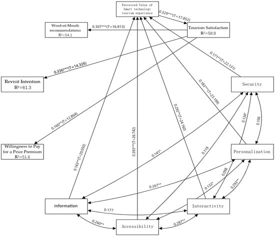 Normally, the standard path coefficient represents the influence relationship between variables. If it is significant, it indicates an obvious effect between variables. As shown in Table 6 and Figure 2, this study has ten variables. Five first-order variables are used to create a second-order variable—perceived value of smart technology tourism experience. Firstly, this study analyzed whether these five first-order variables are related to second-order variables. The results showed a significant correlation between attributes (the accessibility having the strongest aboriginality) of STTs and tourists’ perceptions of their smart technology tourism experience. Therefore, the results support Hypothesis 1.