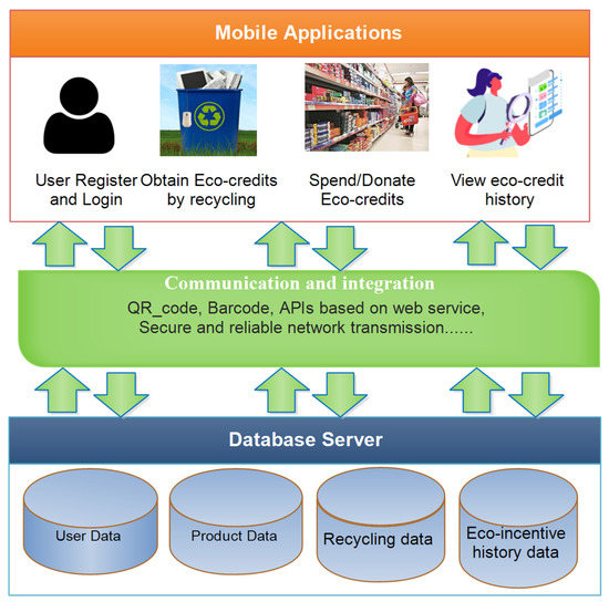 The middle layer is responsible for the communication and interaction based on multiple ICT technologies, such as QR code, barcode, Internet communication technologies, and APIs based on web services. The QR code is used to identify a consumer account when the consumer spends/donates their eco-credits, and the barcode is utilised in the communication with the intelligent bin which stores the recycled EoL products. The APIs based on web services are used to facilitate the data exchange between the database server and the mobile application. To assure the trustworthiness among value networks, the technology of secure and reliable network transmission is also adopted in the middle layer.
