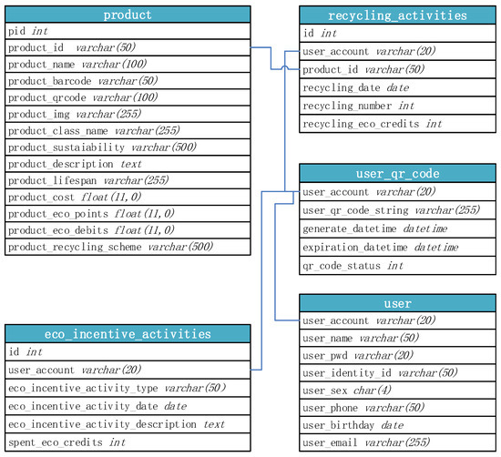 In order to implement the above function modules, it is necessary to design a data scheme related to the eco-incentive system. In the eco-incentive system, there are various kinds of data, such as dynamic data for recycling activities, eco-incentive history, and other information related to consumers and products. Those data are managed by utilising the so-called Navicat Premium, a data management tool [25]. Based on the Navicat Premium platform, we design the data scheme for the eco-incentive system, and create relevant data tables in the MySQL server. In the eco-incentive system, there are five main databases: user database, userQR code database, product database, recycling activities database and eco-incentive activities database. The user database is used to store the consumer’s name, account, password, eco-cost total, eco-credit total and other personal information, such as email, gender, birthday, phone, head_img (portrait image), the string of QR code and so on. The relation information between the consumers’ user account and user QR code is stored in the userQR code database. The product database is for storing product ID, product name, product barcode, product image, product category and other eco-information, such as product’ eco-cost values, product sustainability, product recycling scheme, product lifespan, etc. The information related to consumers’ recycling activities (such as user account, recycled product ID, recycling date, recycling number, recycling eco-credits, etc.) are stored in the recycling activities database. As for the eco-incentive history, the information related to consumers’ eco-incentive activities (such as user account, eco-incentive’s activity type, activity date, activity description, spent eco-credits, etc.) are stored in the eco-incentive activities database. To better understand and describe the interaction between five data models, the relationship among them is shown in Figure 3.