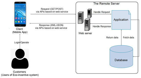 To develop the APIs based on RESTful web services, the PHP development language is adopted to edit the source code, and the PHP running environment is configured and deployed in the remote web server to execute the codes of APIs based on RESTful web services. The description of the main APIs used in the eco-incentive system is shown in Appendix A. The API_URL denotes “http://bs.cifuwu.com/api (accessed on 11 November 2021)”, and GET and POST represent two kinds of request from the mobile application. All the APIs based on the RESTful web service are deployed and executed in the remote web server.
