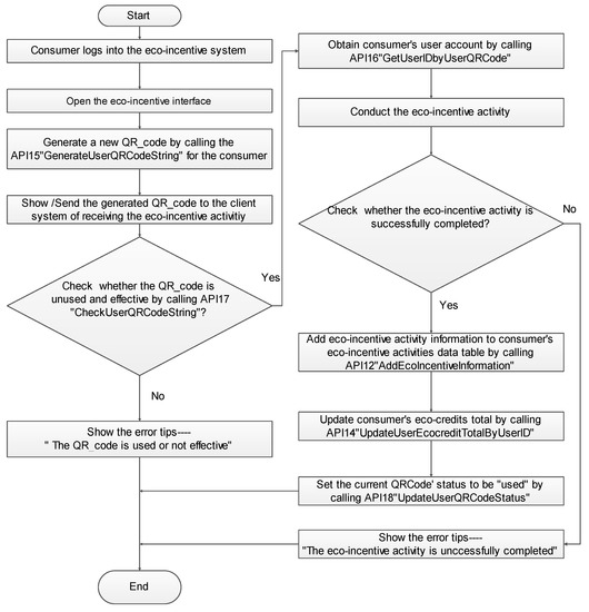 As shown in Figure 5, when a consumer logs into the eco-incentive system and opens the eco-incentive interface, the system will generate a new QR code by calling the API15 “GenerateUserQRCodeString” for the consumer. Then, the generated QR code is to be shown or sent to the client system receiving the eco-incentive activity. The client system, such an eco-incentive machine, calls the API17 “CheckUserQR CodeString” to check whether the received QR code is unused and effective. If the QR code is not used and is not beyond the period of validity, the system obtains the consumer’s user account by calling API16 “GetUserIDbyUserQRCode” to complete the eco-incentive activity. Then, the information related to the eco-incentive activity is added into the eco-incentive activities database by calling API12 “AddEcoIncentiveInformation”, and the consumer’s eco-credit total is reduced and updated by calling API14 “UpdateUserEcocredit_TotalByUserID”. Finally, the current QRCode’ status is set as “used” by calling API18 “UpdateUserQRCodeStatus”.