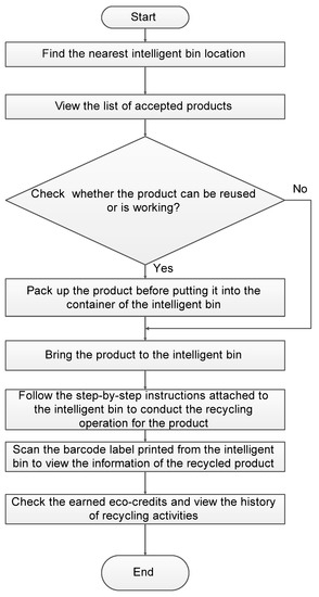 The procedure of obtaining eco-credits by recycling products is shown in Figure 7. To recycle products, with the information shown on the mobile application, the consumer can find the location of an intelligent bin, in which the consumer can place the product to be recycled and view the types of products that can be accepted by the intelligent bin. If the product is still in a working condition, but the user wants to put it in the recycle system, the user has to pack the product with proper packaging materials such plastic bubbles to avoid damaging the product before putting it into the container of the intelligent bin. Step-by-step instructions are attached to the intelligent bin for the consumer to conduct the operation. Figure 8 shows the operation procedure of the intelligent bin with the mobile application. After collecting the recycled products from the intelligent bin, the recycle centre evaluates the recycled products and calculates the corresponding eco-credits of each recycled items. Then, eco-credits related to the recycled products are added to the consumers’ eco-credit total. Afterwards, the consumers can scan the barcode labels, which were received from the intelligent bin when recycling the product, to view the information of the recycled product and check the earned eco-credits. The history of their eco-recycling activities can also be viewed.