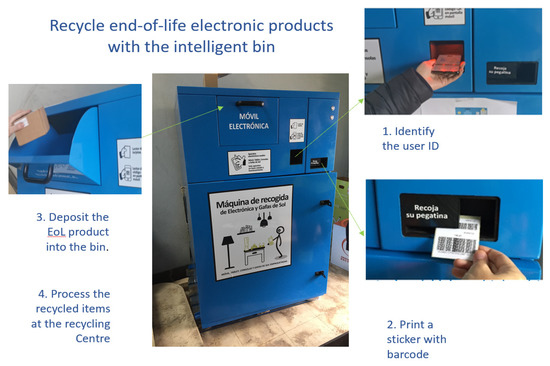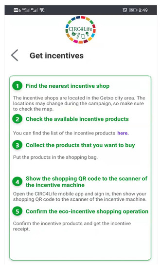 The demonstration of the circular economy business model developed by the CIRC4Life project took place in Basque Country, Spain [27]. The demonstration includes recycling EoL electronic products, such as computer tablets and mobile phones, and eco-incentives for the recycling activities. The mobile application for the eco-incentive presented above was applied in the demonstration, which is presented in this section to illustrate the mobile application.