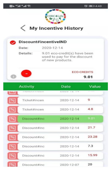 Based on the mobile eco-accounting framework, a novel mobile application for eco-incentive is developed by this research and reported in this paper. To overcome the challenges stated above, this mobile application using an eco-incentive scheme awards eco-credits to consumers who recycle EoL products, and consumers can be incentivized with these eco-credits in ways such as offering discounts for shopping. In the calculation of the eco-credits, a product’s impact on the environment is taken into account via the product eco-cost. Thus, the eco-incentive scheme connects the consumer’s footprints to their eco-accounts and reflects the products’ environmental impacts.