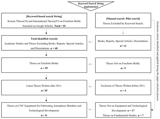 In order to implement PRISMA, the search engine which was suitable for the data collection was selected. Among the many search engines—such as Scopus, PubMed, WOS, and Google Scholar—the study chose to use Google Scholar. Google Scholar allows auto-searching and inclusive literature searching. In order to collect enough studies related to free-form molds, ‘OR’ was used instead of ‘AND’ for an inclusive search of the data.
