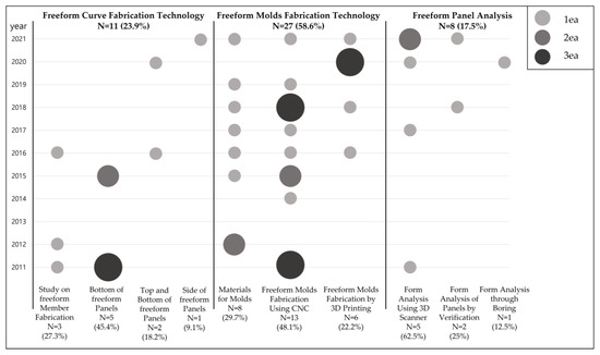 Figure 2 shows the number of publications written in each year, using images. There were 11 publications on free-form curve fabrication technology, and they took up 23.9%. There were 27 publications on free-form mold fabrication technology, and they took up 58.6%. There were eight publications on free-form panel analysis, and they took up 17.5%. A total of 31 publications were selected by PRISMA, but some publications were redundantly categorized into two or three categories, for a total of 46 publications in the categories.