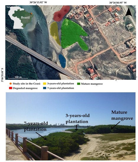Location of the studied mangrove in the Cocó River estuary, and the degraded (red area) and mature (green area) mangrove and plots with 3-year-old (yellow area) and 7-year-old plantations (blue area). The satellite image was obtained from Google EarthTM. In the satellite image, the XY axes represent latitude and longitude. In the detail (bottom photo) are the plots with 3- and 7-year-old plantations compared with mature mangroves, showing the vegetation development differences. Photo credits: Claudia Albuquerque, Igor de Melo, and Michele Boroh.